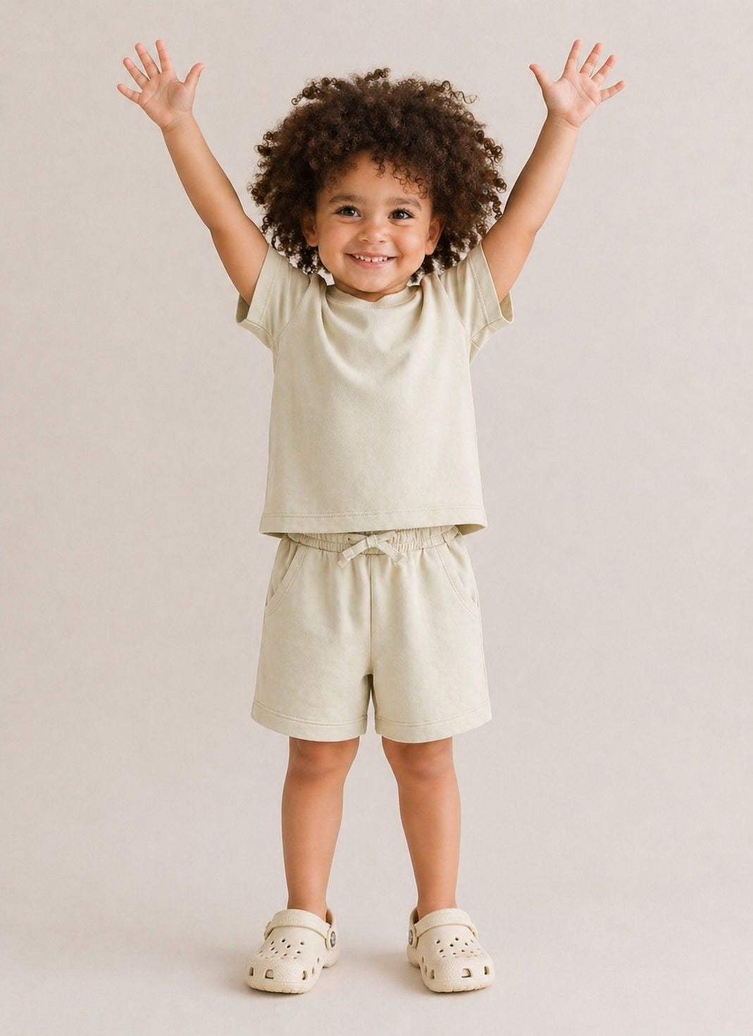 A two-piece set crafted from soft textured cotton in a creme hue. Designed for comfort, movement, and everyday little adventures.
